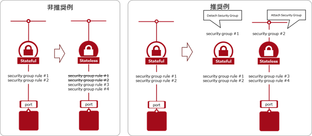 セキュリティグループの Statefulを変更する場合には、セキュリティグループのルールの編集後にセキュリティグループの Statefulを変更するのではなく、あらかじめ Statefulが「True」と「False」であるセキュリティグループを1つずつ作成(変更前後の2つを準備)、かつセキュリティグループのルールを設定します。そのうえで、変更前のセキュリティグループを取り外し(detach)、変更後のセキュリティグループを取り付ける(attach)ことを推奨します。これにより、切り戻し時においても変更前のセキュリティグループにattachすることで、速やかにセキュリティグループの Statefulをバックアウトすることができます。